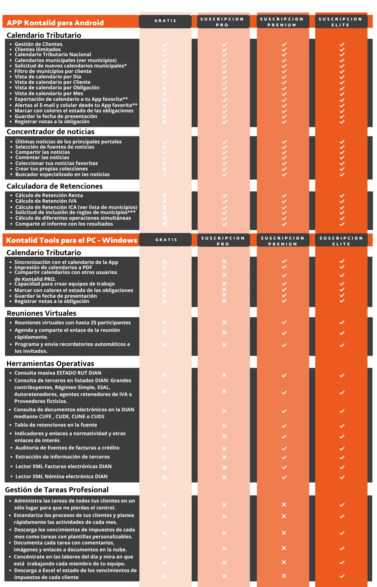 Kontalid es la navaja suiza de los contadores: la herramienta todo en uno que reúne todo lo que necesitas para simplificar tu día a día, desde calendarios tributarios automatizados y gestión de tareas en equipo hasta extracción de datos de terceros y herramientas operativas que liberan horas valiosas. No más hojas de excel y apps dispersas ni procesos manuales que roban tu tiempo; con una sola suscripción ANUAL Premium o Élite tienes la productividad, el control y la tranquilidad que mereces para enfocarte en crecer tu negocio y disfrutar tu vida.